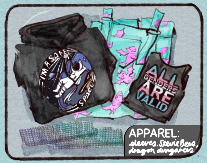 Next comes my apparel. Besides my dragon dresses and dragon dungarees, I adore the hand knit sleeves and other treasures from my mom — and I’m also proud to wear the safe space and advocacy clothing from Stevie’s Safe Spaces! (The sweatshirt is my design — an honor!)