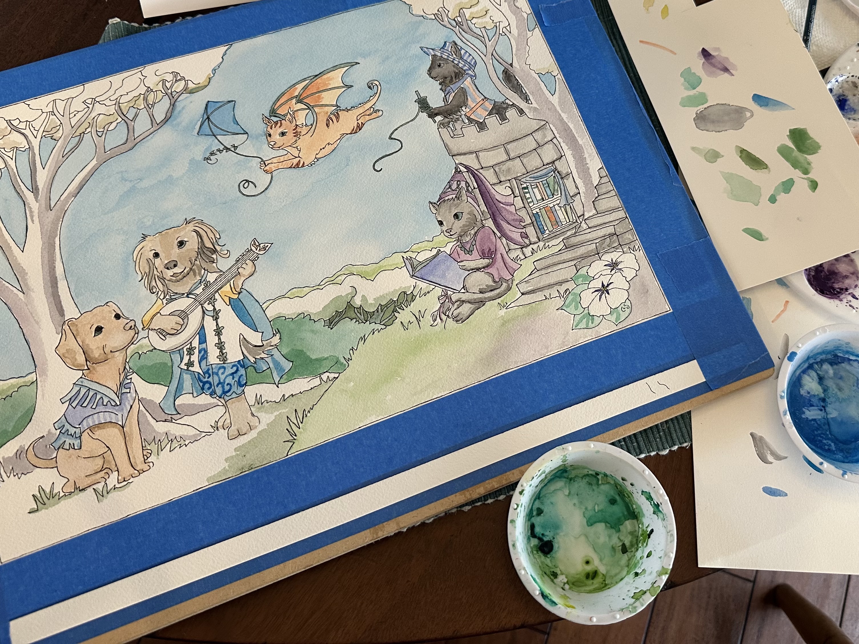 I couldn’t wait to meet the buyers and learn what they’d like me to paint for them. It turns out they were two amazing women who wanted to decorate a room for their child-to-be — and they wanted to see their five pets and a bit of fairy-tale imagination. Perfect for this magic-believing, animal-loving children’s book illustrator!
